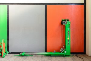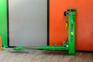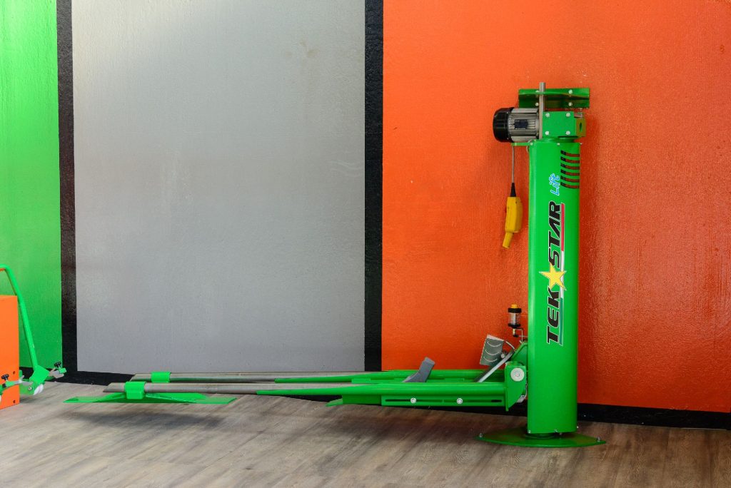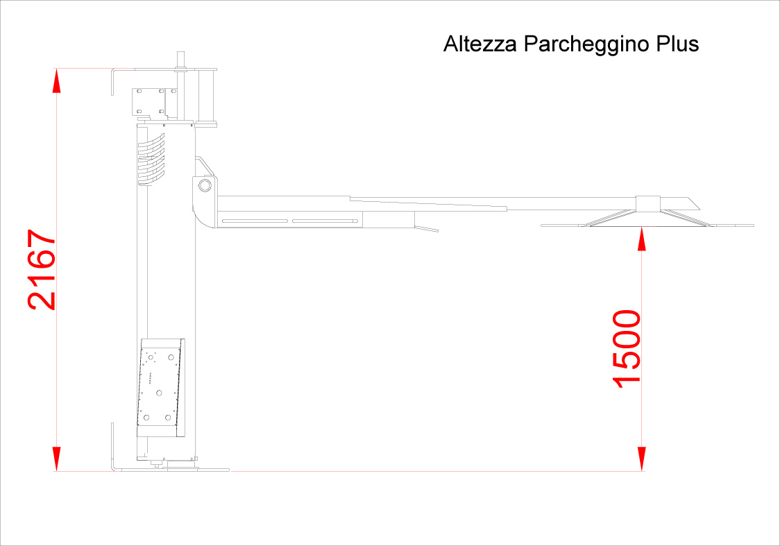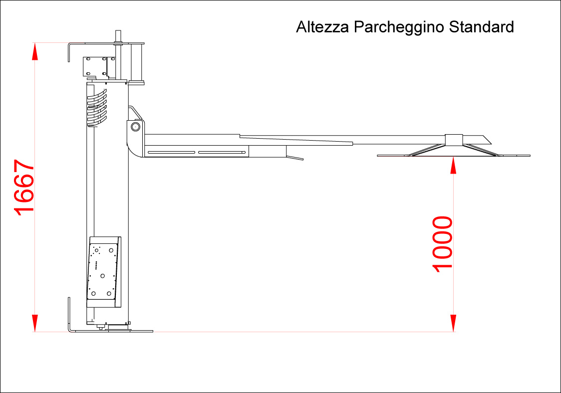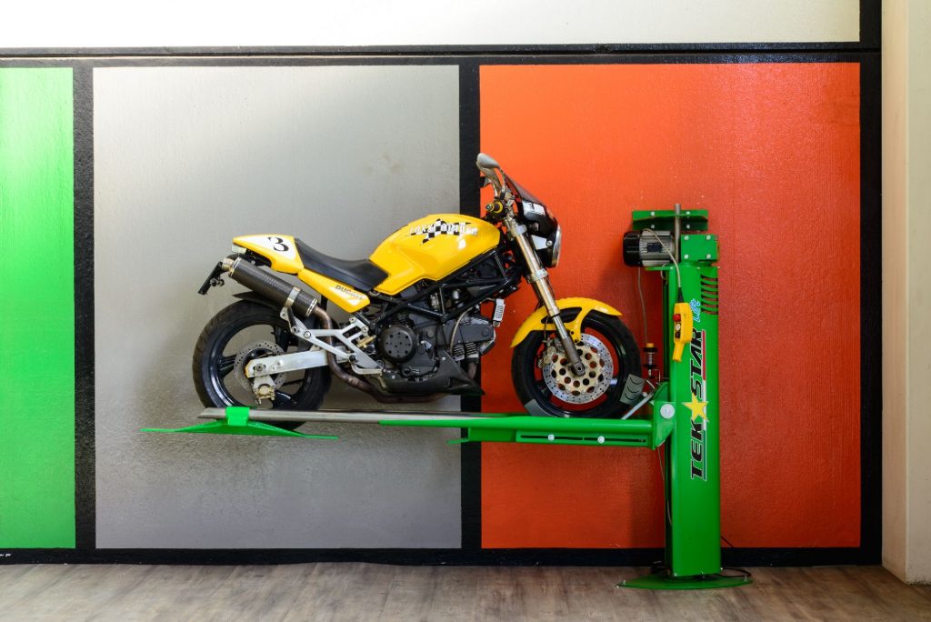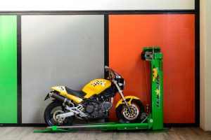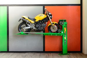 Space-saving, single column electric worm gear lift for motorcycles, foldable and closable at 180°. Named as a lifter or parking for small garages capable of superimposing the motorcycle to the car, with self-levelling cantilever weight system PATENTED
